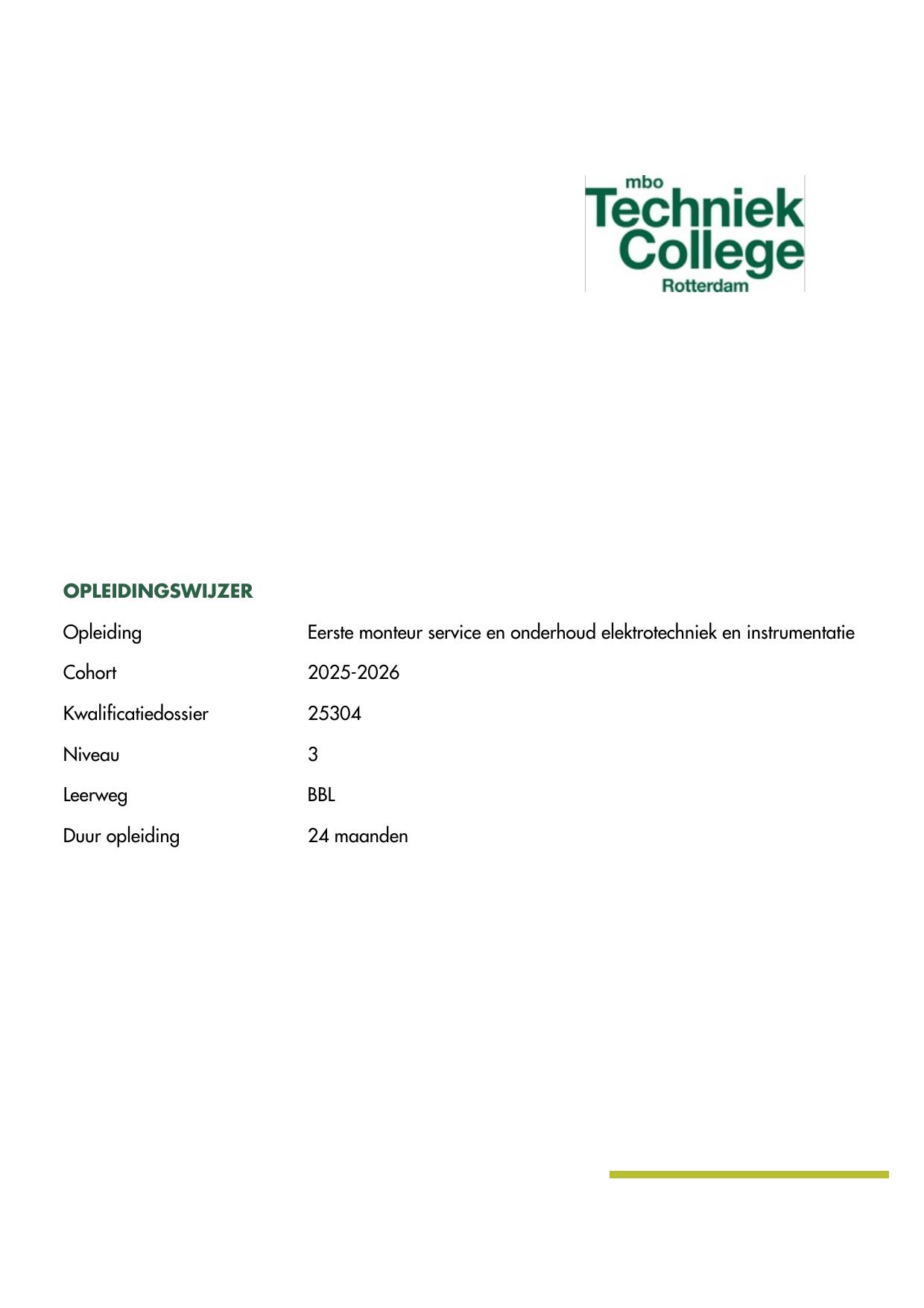 Eerste monteur service en onderhoud elektrotechniek en instrumentatie A25304-BBL in cohort 2025-2026